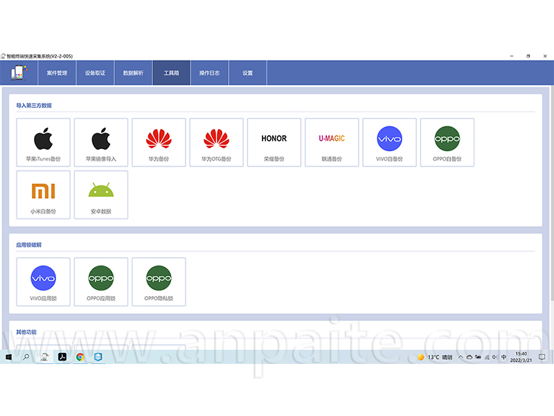 ▶手机系统信息、手机多媒体文件、社交聊天类、社交自媒体类、视频活动类、电子商务类、供求网站类、浏览器类、网络论坛类、金融证券类、网络订购类、地图应用类、票务预定类、网络共享类、电子邮件类、翻墙工具、境外通讯类、密码提取、其他(特殊App)等