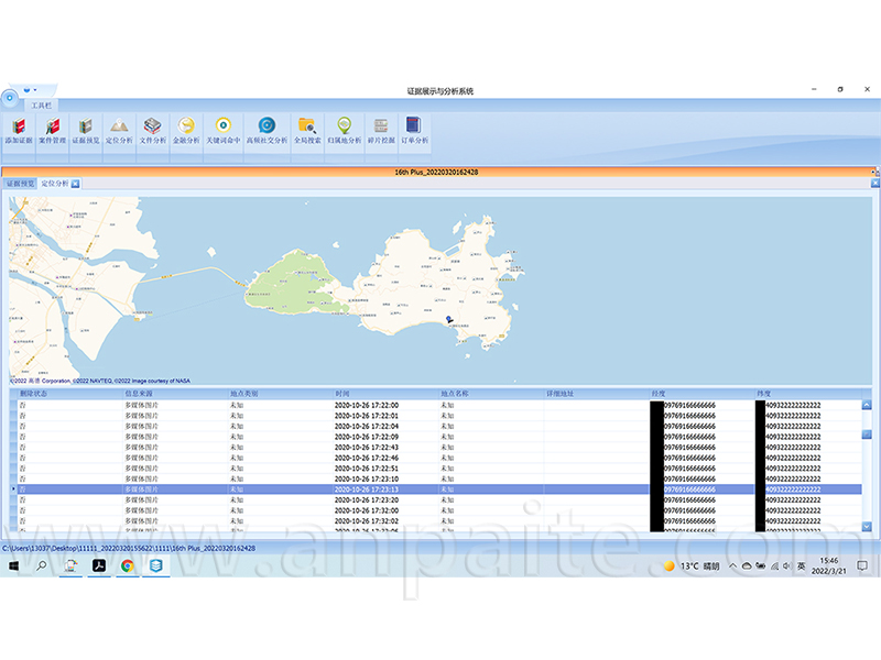 获取手机中地理位置信息,在定位分析工具中展现,包括照片和地图导航类的位置,位置信息直观的展现在地图上